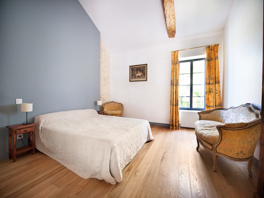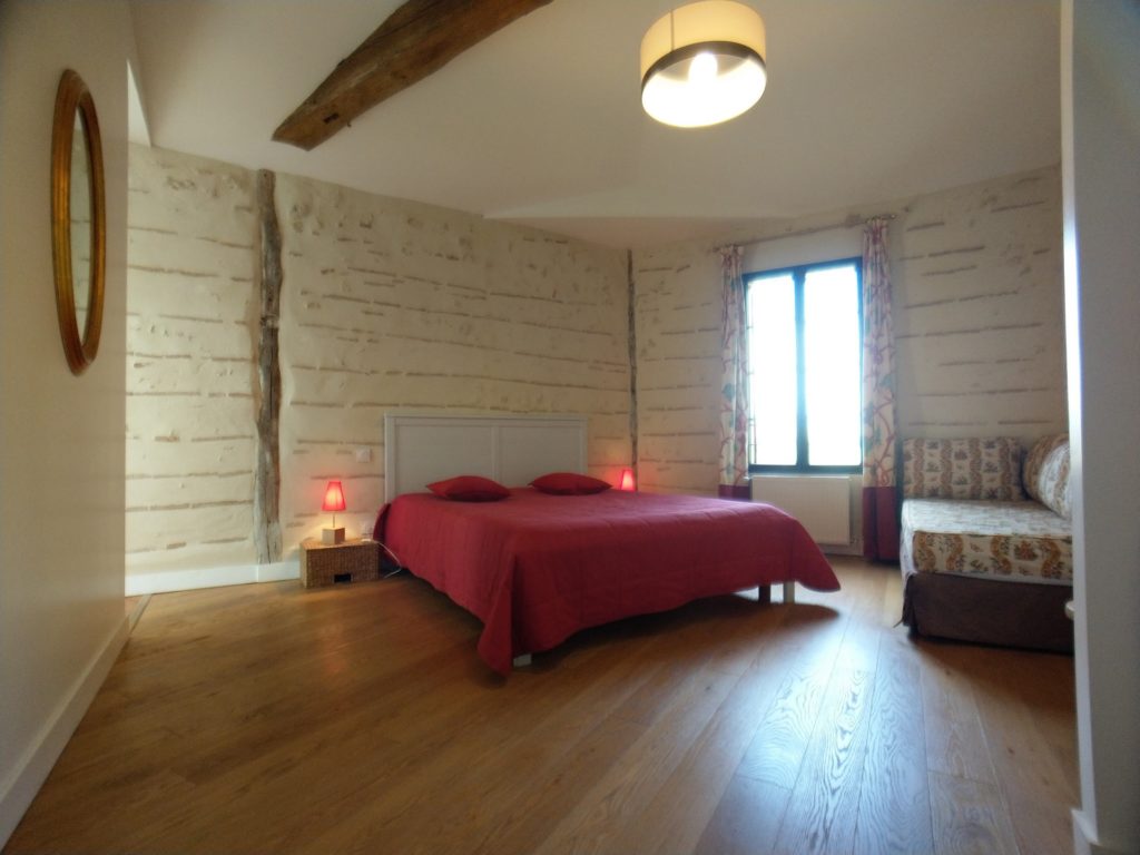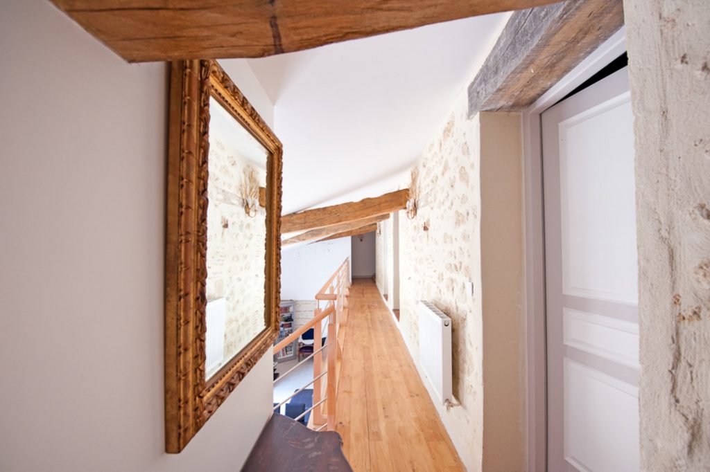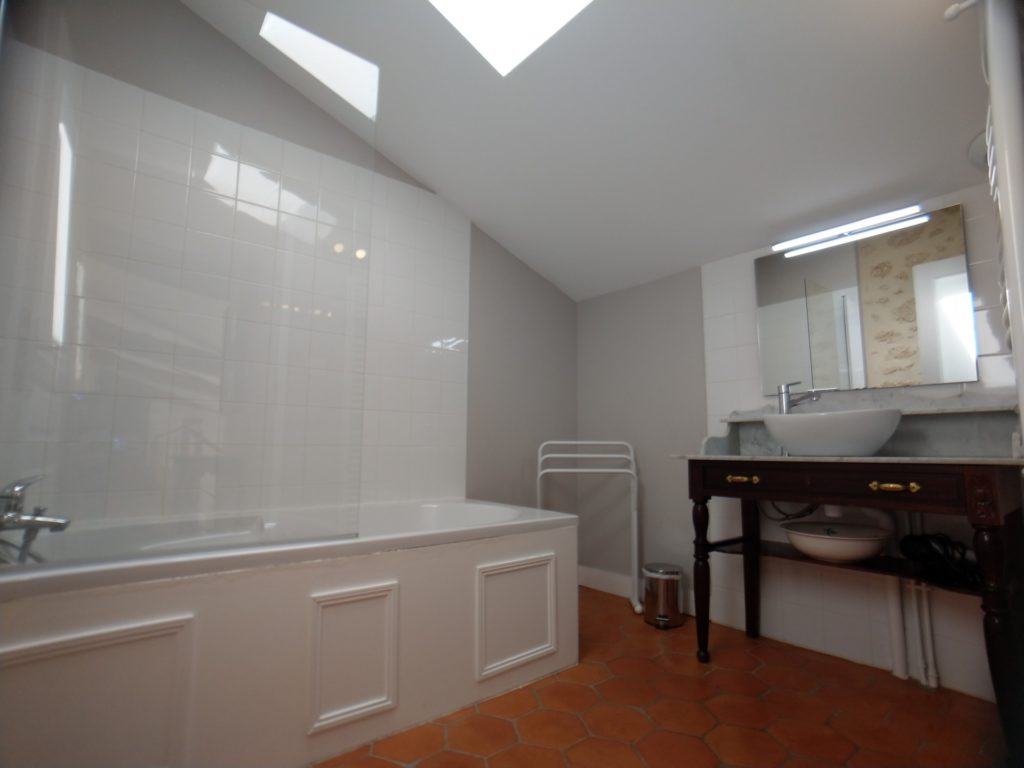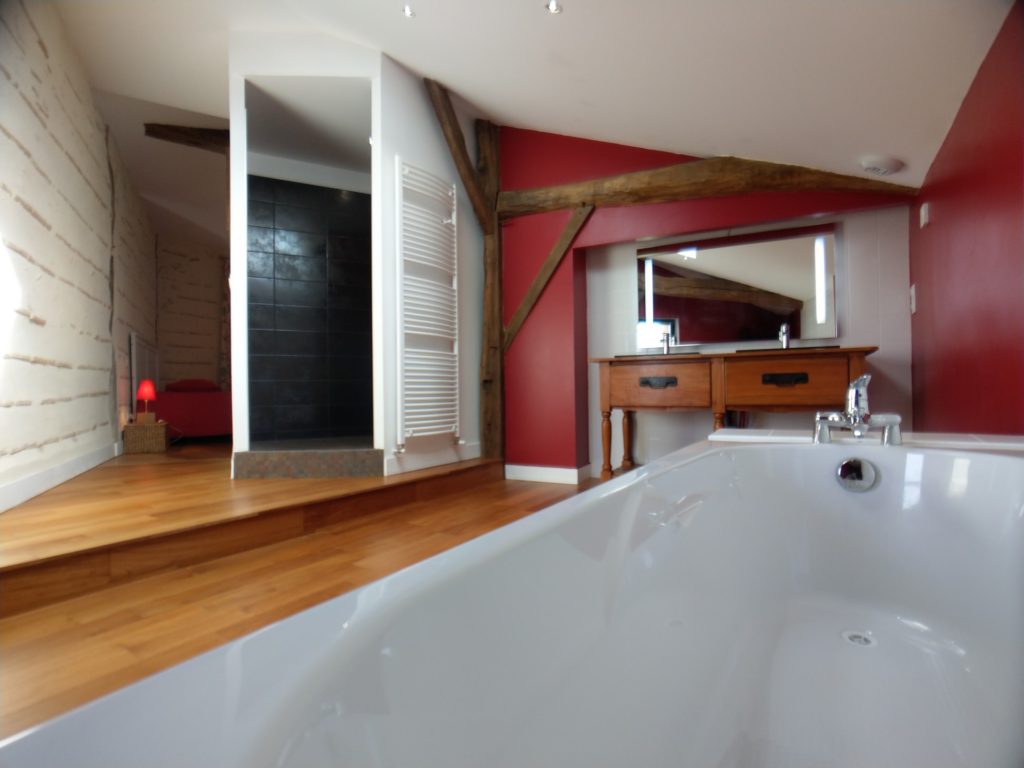 En plus de cette chambre, 4 autres sont à l’étage et sont desservies par la mezzanine. À cet égard elles offrent toutes de grands volumes (belle hauteur sous plafond, superficie entre 20 et 25m²). 3 de ces chambres ont une salle de bain commune avec baignoire.