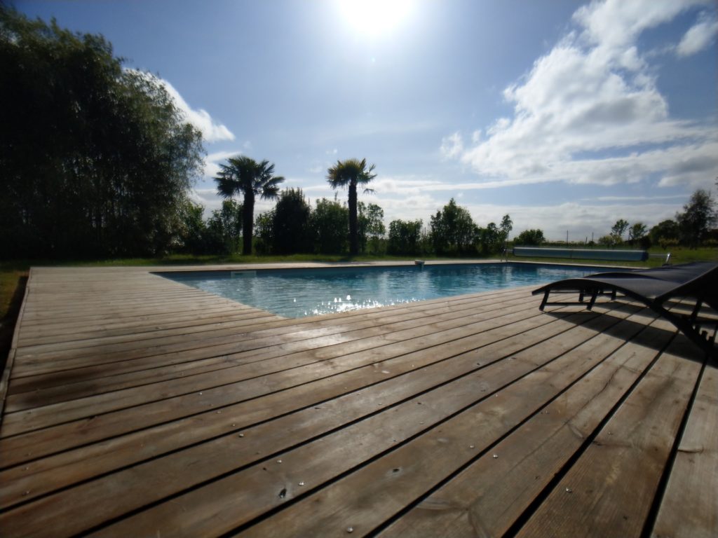 Tout d’abord la piscine a une dimension de 12x4m. Traitée au brome (sans odeur) et ouverte de Mai à Septembre, une température minimale de 26°C vous est garantie aux périodes d’ouverture (chauffage par pompe à chaleur). Elle possède une couverture solaire notamment pour la chauffer afin de maintenir une température de l’eau optimale c’est-à-dire entre 28 et 32°C en condition estivale ainsi que d’une terrasse périmétrique en bois avec douche solaire et transats. De plus elle est sécurisée par une alarme à détection de chute. Cependant cet équipement ne remplace pas la surveillance d’un adulte.